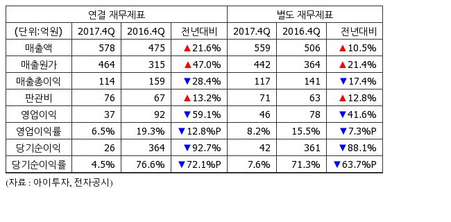 지난해 4분기 별도기준 매출액은 559억4185만원으로 전년 동기 506억1239만원 대비 10.5% 늘었다. 같은 기간 영업이익은 46억234만원으로 전년 동기 78억8685만원 대비 41.6% 감소했고, 순이익은 42억7473만원으로 전년 동기 361억877만원 대비 88.1% 감소했다.