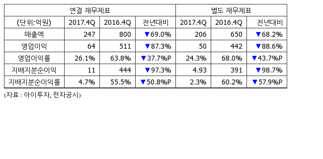 지난해 4분기 별도기준 매출액은 206억4891만원으로 전년 동기 650억3239만원 대비 68.2% 감소했다. 같은 기간 영업이익은 50억1692만원으로 전년 동기 442억3866만원 대비 88.6% 감소했고, 순이익은 4억9313만원으로 전년 동기 391억9352만원 대비 98.7% 감소했다.