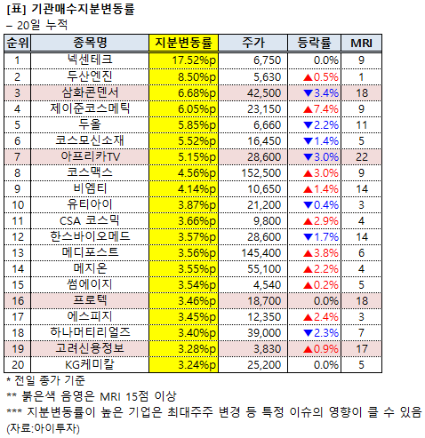 최근 20일 기관 순매수 지분율이 높은 종목으로는 1위 넥센테크(17.52%)에 이어 두산엔진(8.50%), 삼화콘덴서31,250원, ▲550원, 1.79%(6.68%) 등이 상위권에 올랐다.