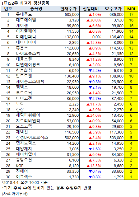 [52주 최고가] 롯데푸드 등 30개 종목 장중 신고가