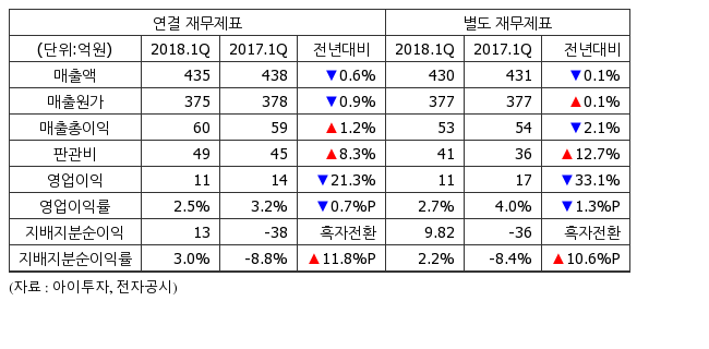 1분기 별도기준 매출액은 430억9519만원으로 전년 동기 431억4588만원 대비 0.1% 감소했다. 같은 기간 영업이익은 11억7624만원으로 전년 동기 17억6032만원 대비 33.1% 감소했고, 순이익은 9억8164만원으로 전년 동기 -36억2768만원에서 흑자전환했다.