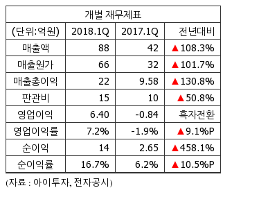 아즈텍WB1,264원, ▲11원, 0.88%의 1분기 개별기준 영업이익이 6억4044만원으로 전년 동기 -8382만원에서 흑자전환했다.15일 전자공시에 따르면 아즈텍WB의 1분기 매출액은 88억1596만원으로 전년 동기 42억3226만원 대비 108.3% 증가했고, 순이익은 14억7822만원으로 전년 동기 2억6486만원 대비 458.1% 증가했다.
