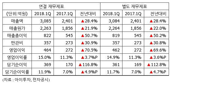1분기 별도기준 매출액은 3084억5912만원으로 전년 동기 2401억9883만원 대비 28.4% 늘었다. 같은 기간 영업이익은 462억2282만원으로 전년 동기 272억4715만원 대비 69.6% 늘었고, 순이익은 361억2382만원으로 전년 동기 169억6947만원 대비 112.8% 증가했다.