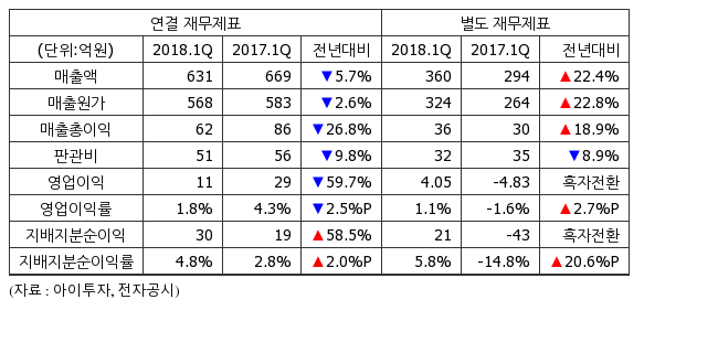 1분기 별도기준 매출액은 360억7881만원으로 전년 동기 294억6728만원 대비 22.4% 늘었다. 같은 기간 영업이익은 4억524만원으로 전년 동기 -4억8275만원에서 흑자전환했고, 순이익은 21억930만원으로 전년 동기 -43억6837만원에서 흑자전환했다.