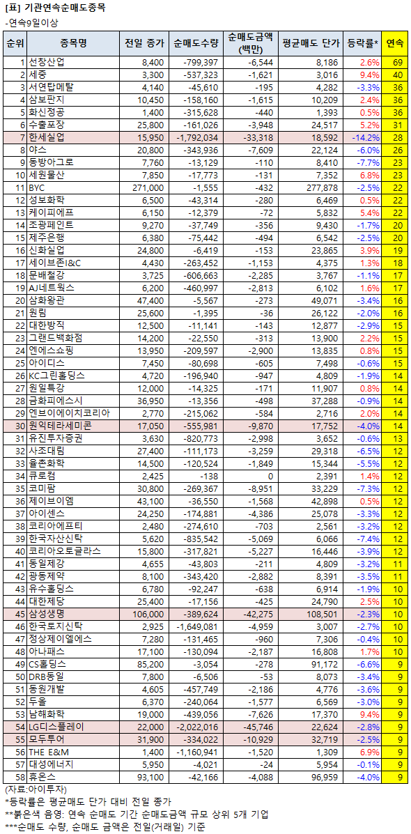 전일까지 기관 투자자가 9일 이상 연속 순매도한 종목은 남해화학 포함 모두 58개다. 선창산업(69일), 세중(40일), 서연탑메탈(36일) 등이 상위권에 올랐다. 새로 목록에 포함된 기업은 휴온스28,450원, ▲500원, 1.79%, 동원개발2,720원, ▲40원, 1.49% 등 총 10개다.
