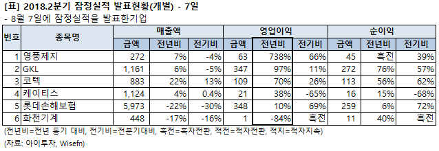 8일 아이투자(www.itooza.com)는 지난 7일 2018년 2분기 잠정실적을 발표한 기업을 집계했다.