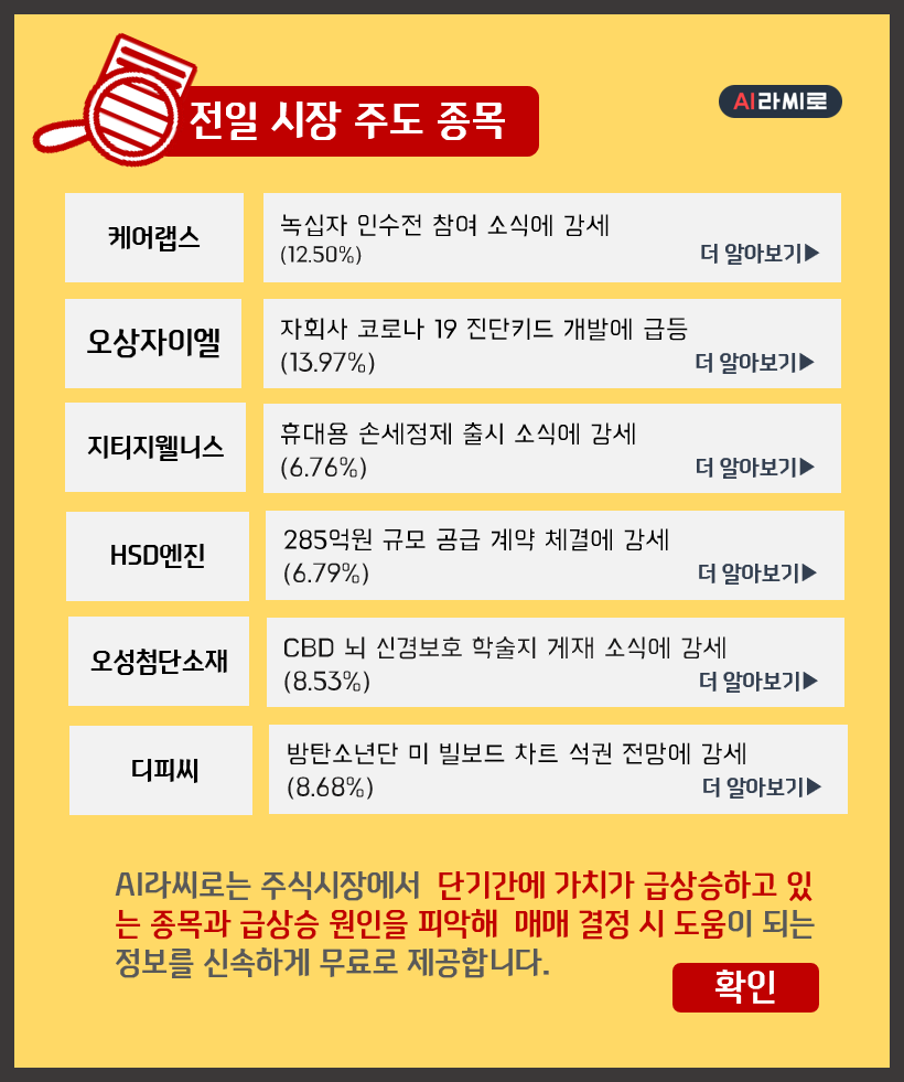 전일 시장 주도 종목 –오상자이엘(13.97%), 케어랩스(12.5%), 디피씨(8.68%)…