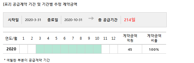 계약기간은 2020년 3월 31일부터 2020년 10월 31일까지 총 공급기간은 214일이다. 이번에 체결한 공급계약 금액은 최근 매출액 382억3024만원 대비 12% 규모다.