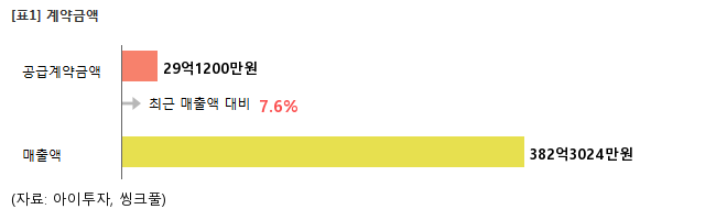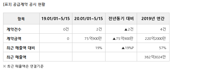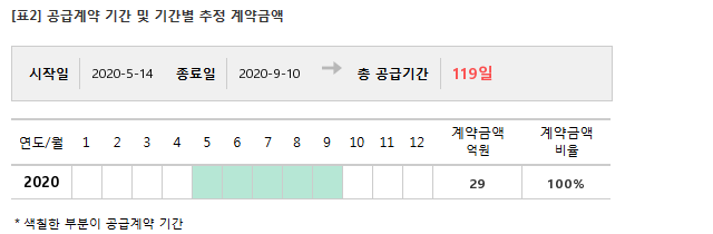 계약기간은 2020년 5월 14일부터 2020년 9월 10일까지 총 공급기간은 119일이다. 이번에 체결한 공급계약 금액은 최근 매출액 382억3024만원 대비 7.6% 규모다.