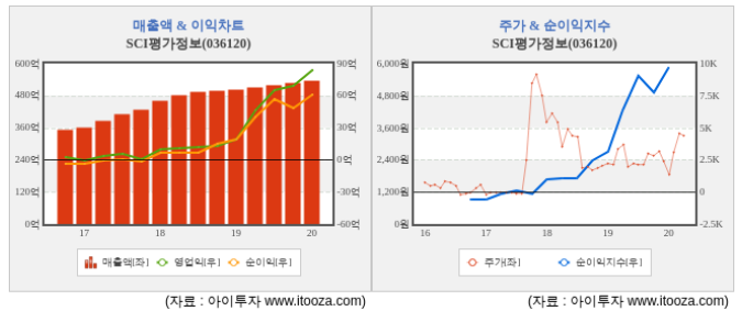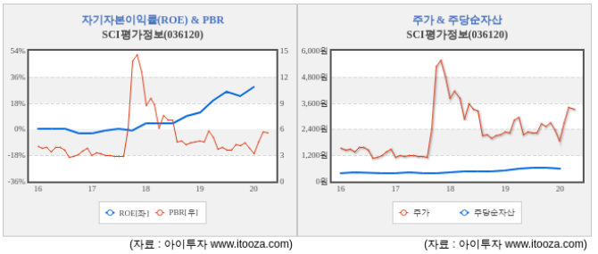 SCI평가정보는 2017년까지 지배지분 순이익이 적자를 내 자기자본이익률(ROE)은 마이너스(-)를 기록했다. 이후 이익이 점차 개선됐고 지난해 가파르게 상승한 덕에 최근 ROE는 어느덧 20%를 웃돌았다. 주가순자산배수(PBR)는 지난 2017년 말 주가 상승과 함께 14배를 기록했다. 올해 3월 급락 땐 3배까지 하락했고 현재 기록 중인 PBR은 5.43배다.