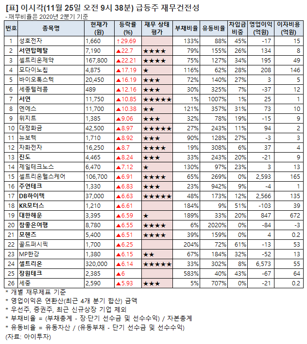 같은 시각 성호전자는 상한가에 거래되고 있다. 이 밖에 셀트리온제약62,900원, ▲200원, 0.32%, 바이오톡스텍2,670원, ▲10원, 0.38%, 세종텔레콤12,460원, ▼-890원, -6.67%, 뉴보텍1,251원, ▲10원, 0.81%, 자화전자24,600원, ▲100원, 0.41%, 진도2,010원, 0원, 0% 등도 상승 폭이 크다. 전일 대비 6% 이상 오른 종목 가운데 재무건전성에서 '별 다섯 개'를 받은 종목은 서연10,130원, ▲110원, 1.1%, 대정화금13,310원, ▼-20원, -0.15%, DB하이텍67,600원, ▲1,100원, 1.65% 등 4개다.