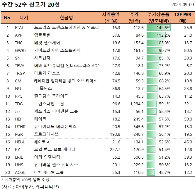 지난주 미국증시에서 52주 신고가를 기록한 종목은 포트리스 트랜스포테이션 & 인프라(FTAI), 앱플로빈(APP), 테넷 헬스케어(THC), 가이드와이어 소프트웨어(GWRE), 샤크닌자(SN) 등 184종목(시가총액 100억 달러 이상)으로 집계됐다.