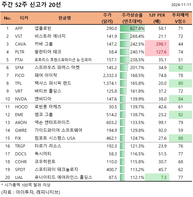 지난주 미국증시에서 52주 신고가를 기록한 종목은 앱플로빈(APP), 비스트라 에너지(VST), 카바 그룹(CAVA), 팔란티어 테크(PLTR), 포트리스 트랜스포테이션 & 인프라(FTAI) 등 291종목(시가총액 100억 달러 이상)으로 집계됐다.