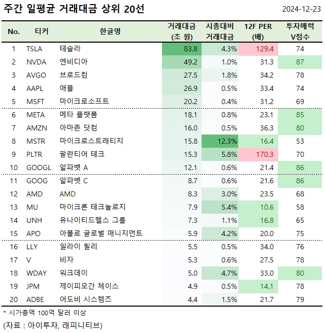이 밖에 엔비디아(NVDA), 브로드컴(AVGO), 애플(AAPL), 마이크로소프트(MSFT) 등도 거래대금이 많았다.