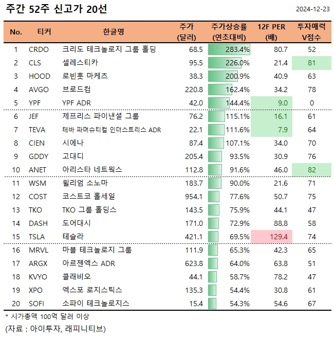 지난주 미국증시에서 52주 신고가를 기록한 종목은 크리도 테크놀로지 그룹 홀딩(CRDO), 셀레스티카(CLS), 로빈훗 마케츠(HOOD), 브로드컴(AVGO), YPF ADR(YPF) 등 45종목(시가총액 100억 달러 이상)으로 집계됐다.
