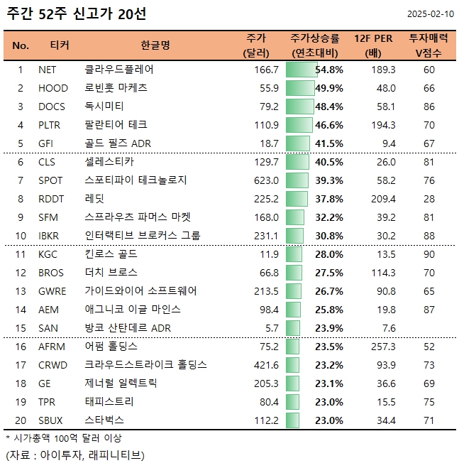 지난주 미국증시에서 52주 신고가를 기록한 종목은 클라우드플레어(NET), 로빈훗 마케츠(HOOD), 독시미티(DOCS), 팔란티어 테크(PLTR), 골드 필즈 ADR(GFI) 등 128종목(시가총액 100억 달러 이상)으로 집계됐다.