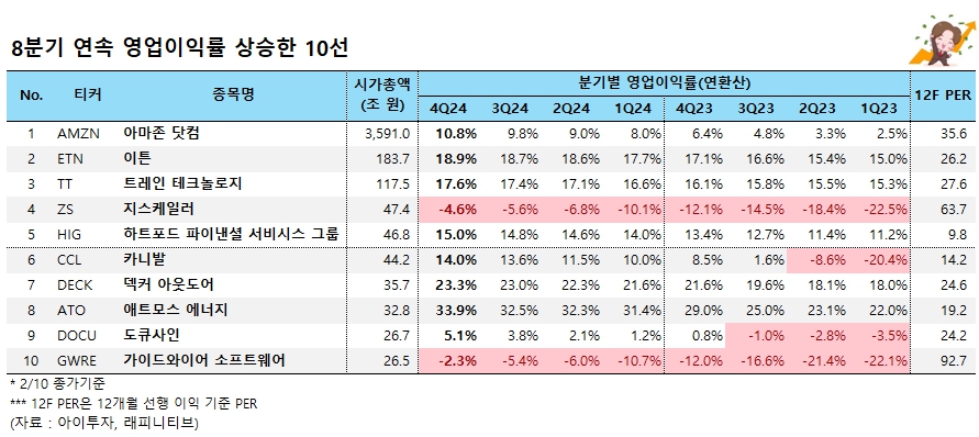최근 8개 분기 동안 영업이익률이 늘고, 매출액과 순이익도 동반 증가한 기업은 아마존 닷컴(AMZN), 이튼(ETN), 트레인 테크놀로지(TT), 지스케일러(ZS), 하트포드 파이낸셜 서비시스 그룹(HIG), 카니발(CCL), 덱커 아웃도어(DECK), 애트모스 에너지(ATO), 도큐사인(DOCU), 가이드와이어 소프트웨어(GWRE) 등이 있습니다.