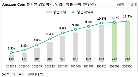 지난해 아마존의 영업이익률 상승의 주요 요인은 수익성이 높은 AWS 사업 성장과 비용 절감 덕분입니다. AWS 부문의 매출은 19% 증가했으며, 영업이익률은 36.8%를 기록하며 아마존 전체 영업이익률 향상에 크게 기여했습니다. 또한 물류 센터의 수명을 기존 10년에서 13년으로 연장하면서 감가상각비용을 낮춰 수익성을 개선했습니다.