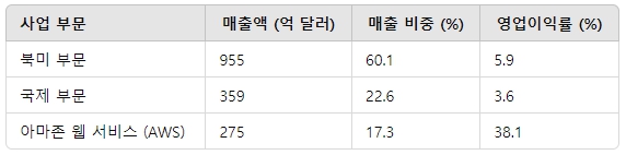 아마존은 전자상거래 사업과 AWS(아마존 웹 서비스) 클라우드 사업을 균형 있게 운영하고 있습니다. 이 덕분에 소비재 업종의 특징(매출 규모가 큼)과 테크 업종 특징(이익률이 높음)을 모두 갖추고 있습니다.