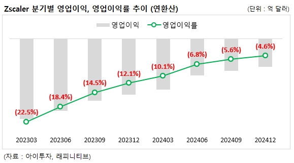 지스케일러의 영업이익률은 2023년 1분기 -22%였지만, 지난해 4분기에는 -4.6%까지 개선되었습니다. 클라우드 보안 수요 증가에 힘입어 같은 기간 매출 성장률이 30~50% 수준을 유지하면서 흑자 전환에 가까워지고 있습니다.