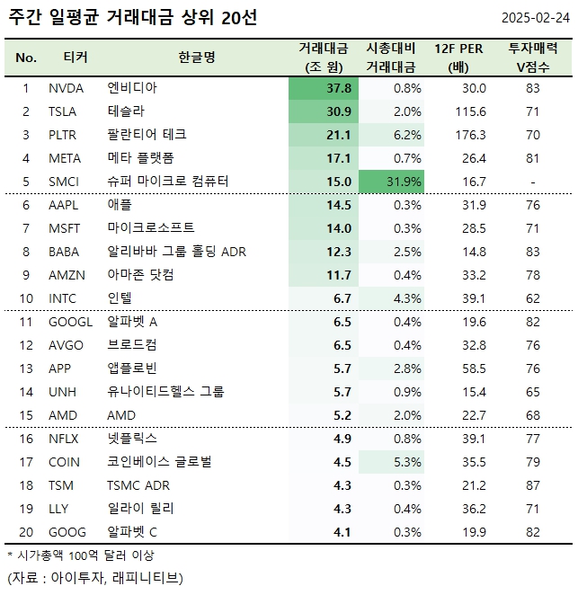 [美 주간탑] 엔비디아, 거래대금 37.8조원 1위.. 거래대금 상위 20선