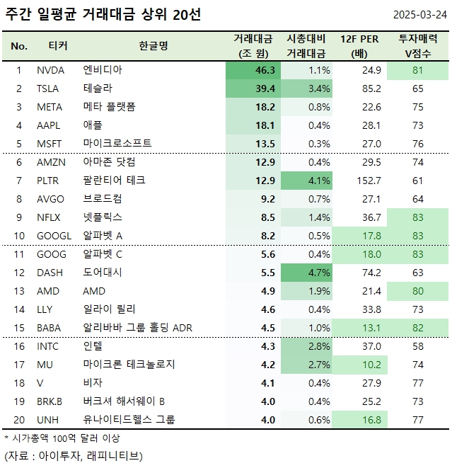 [美 주간탑] 엔비디아, 거래대금 46.3조원 1위.. 거래대금 상위 20선