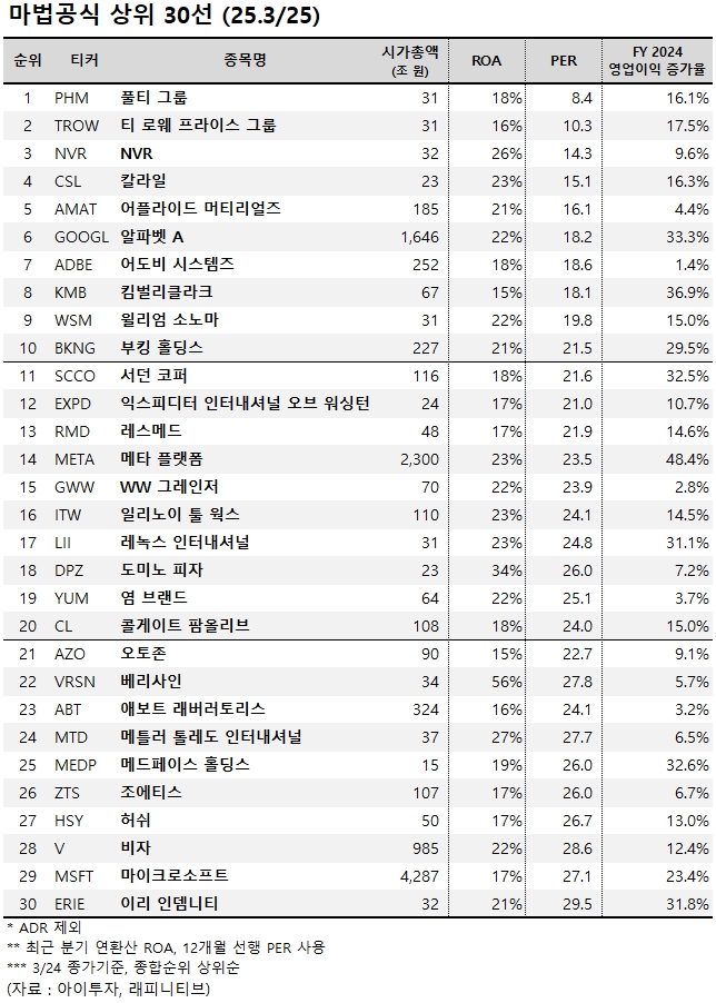 풀티 그룹 외에도 알파벳, 메타, 마이크로소프트 등 주요 빅테크 기업들과 워런 버핏이 선호하는 도미노 피자 등이 마법공식 상위 종목에 포함됐습니다. 이들 기업은 견고한 펀더멘털을 기반으로 안정적인 수익성과 뛰어난 경쟁력을 갖추고 있으며, 상대적으로 덜 부담스러운 밸류에이션에서 거래되고 있습니다.