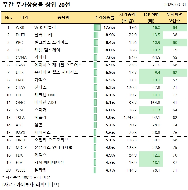 [美 주간탑] W R 버클리, 주간 12.6%↑.. 주가상승률 상위 20선