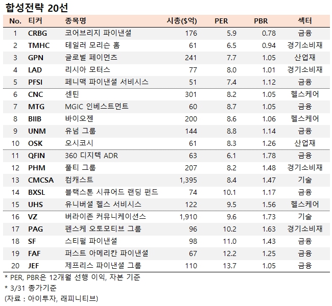▷ 합성전략 20선(전체 섹터) : 코어브리지 파이낸셜(CRBG), 테일러 모리슨 홈(TMHC), 글로벌 페이먼츠(GPN), 리시아 모터스(LAD), 페니맥 파이낸셜 서비시스(PFSI), 센틴(CNC), MGIC 인베스트먼트(MTG), 바이오젠(BIIB), 유넘 그룹(UNM), 오시코시(OSK), 360 디지텍 ADR(QFIN), 풀티 그룹(PHM), 컴캐스트(CMCSA), 블랙스톤 시큐어드 랜딩 펀드(BXSL), 유니버셜 헬스 서비시스(UHS), 버라이존 커뮤니케이션스(VZ), 펜스케 오토모티브 그룹(PAG), 스티펄 파이낸셜(SF), 퍼스트 아메리칸 파이낸셜(FAF), 제프리스 파이낸셜 그룹(JEF)