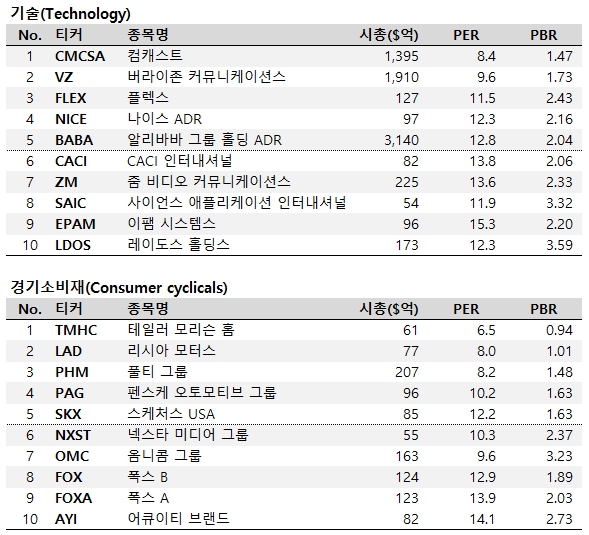 컴캐스트(CMCSA), 버라이존 커뮤니케이션스(VZ), 플렉스(FLEX), 나이스 ADR(NICE), 알리바바 그룹 홀딩 ADR(BABA), CACI 인터내셔널(CACI), 줌 비디오 커뮤니케이션스(ZM), 사이언스 애플리케이션 인터내셔널(SAIC), 이팸 시스템스(EPAM), 레이도스 홀딩스(LDOS)