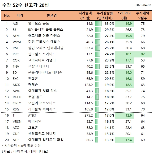 지난주 미국증시에서 52주 신고가를 기록한 종목은 알라모스 골드(AGI), BJ's 홀세일 클럽 홀딩스(BJ), 애그니코 이글 마인스(AEM), 휘턴 프레셔스 메탈스(WPM), 필립 모리스 인터내셔널(PM) 등 60종목(시가총액 100억 달러 이상)으로 집계됐다.
