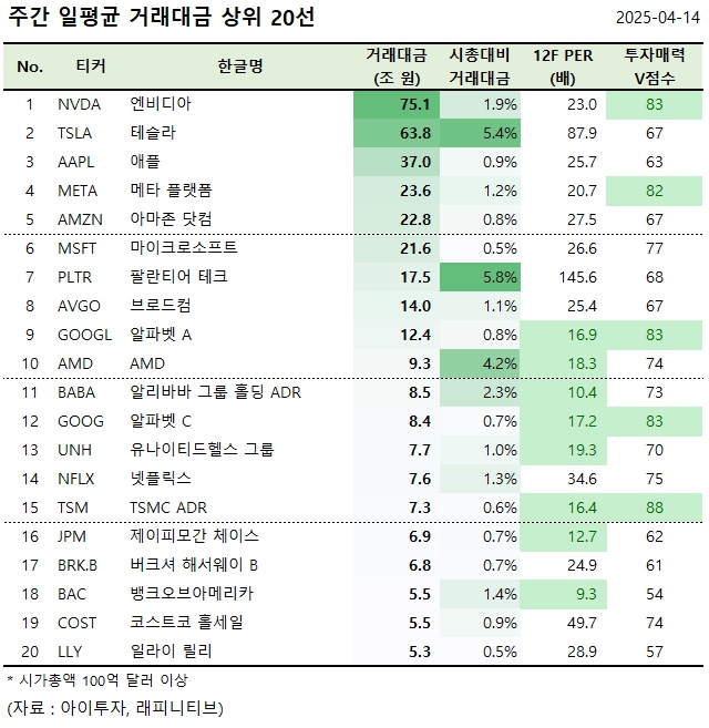 [美 주간탑] 엔비디아, 거래대금 75.1조원 1위.. 거래대금 상위 20선