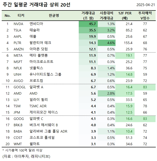 [美 주간탑] 엔비디아, 거래대금 45.7조원 1위.. 거래대금 상위 20선