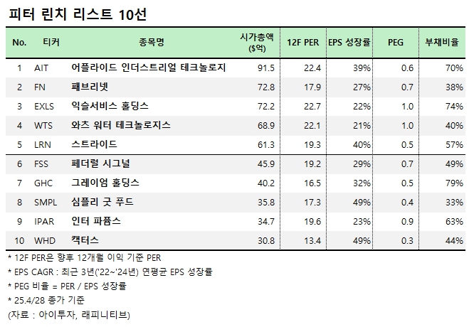 ※ 피터 린치 리스트 10선 : 어플라이드 인더스트리얼 테크놀로지(AIT), 패브리넷(FN), 익슬서비스 홀딩스(EXLS), 와츠 워터 테크놀로지스(WTS), 스트라이드(LRN), 페더럴 시그널(FSS), 그레이엄 홀딩스(GHC), 심플리 굿 푸드(SMPL), 인터 파퓸스(IPAR), 캑터스(WHD)