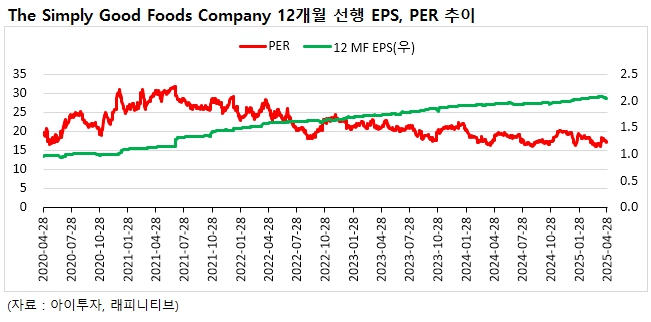 ⑧ 심플리 굿 푸드(The Simply Good Foods Company, SMPL): 심플리 굿 푸드는 건강 지향적인 식품 브랜드를 보유한 소비재 기업으로, 대표 브랜드인 아트킨스(Atkins)와 퀘스트(Quest)를 통해 저탄수화물, 고단백 제품을 중심으로 한 스낵, 식사 대용 제품 등을 제공합니다. 건강 및 체중 관리 트렌드에 맞춘 제품 전략으로 북미 시장에서 꾸준히 성장하고 있습니다.