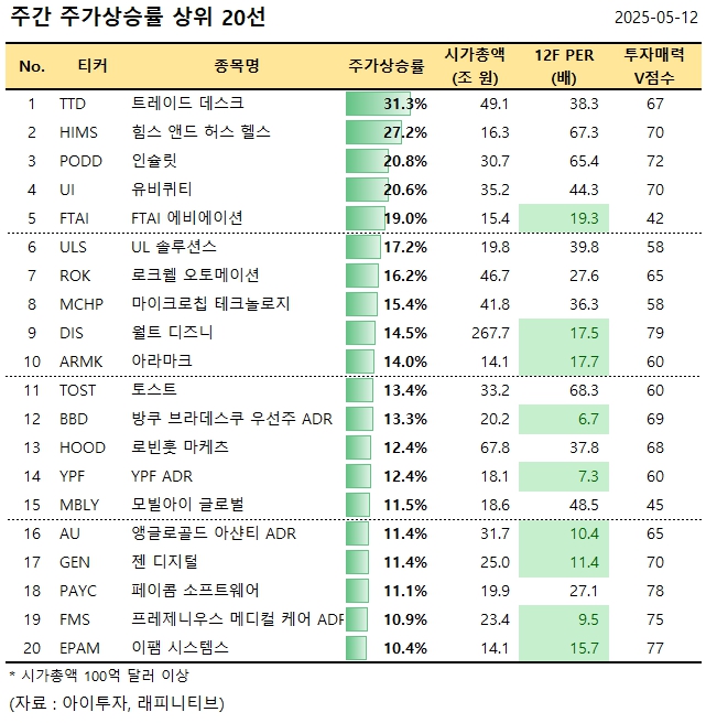 [美 주간탑] 트레이드 데스크, 주간 31.3%↑.. 주가상승률 상위 20선