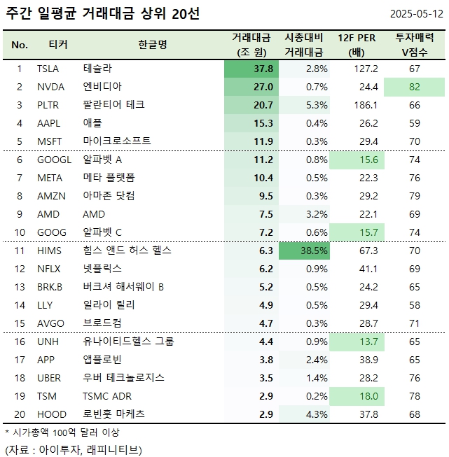 [美 주간탑] 테슬라, 거래대금 37.8조원 1위.. 거래대금 상위 20선