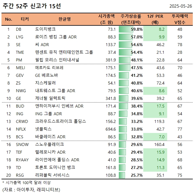지난주 미국증시에서 52주 신고가를 기록한 종목은 도이치뱅크(DB), 로이즈 뱅킹 그룹 ADR(LYG), 씨 ADR(SE), 텐센트 뮤직 엔터테인먼트 그룹 ADR(TME), 필립 모리스 인터내셔널(PM) 등 53종목(시가총액 100억 달러 이상)으로 집계됐다.