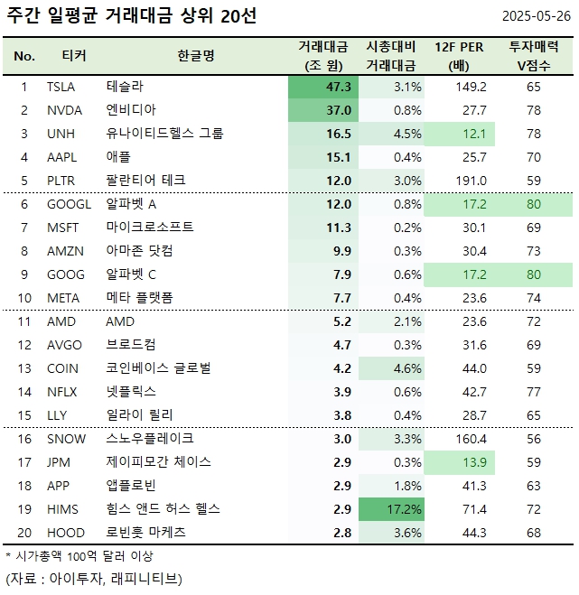 이 밖에 엔비디아(NVDA), 유나이티드헬스 그룹(UNH), 애플(AAPL), 팔란티어 테크(PLTR) 등도 거래대금이 많았다.