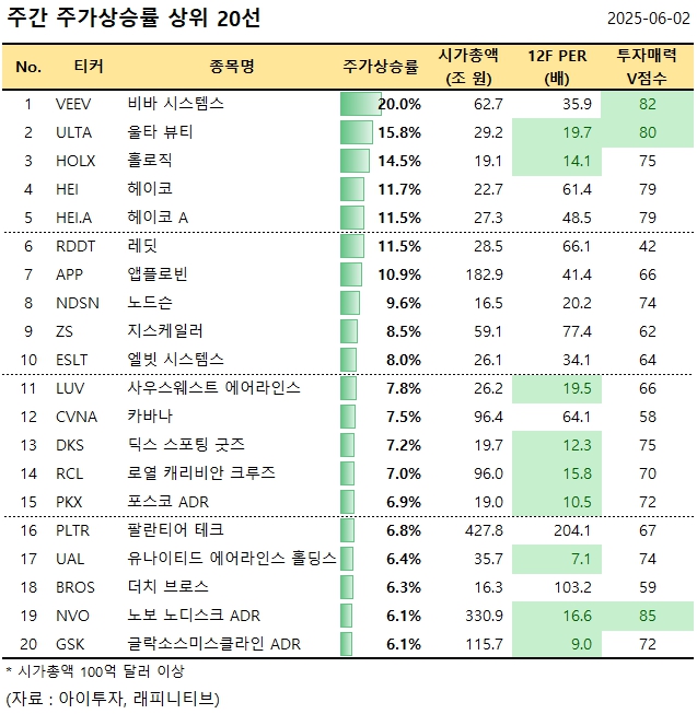 [美 주간탑] 비바 시스템스, 주간 20%↑.. 주가상승률 상위 20선