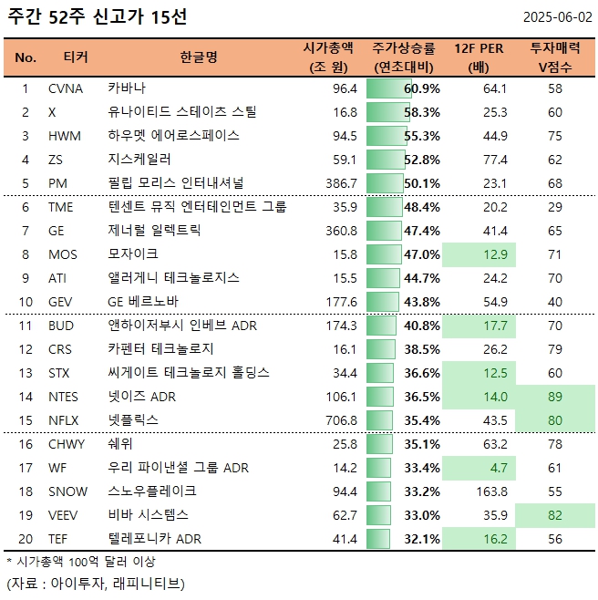 지난주 미국증시에서 52주 신고가를 기록한 종목은 카바나(CVNA), 유나이티드 스테이츠 스틸(X), 하우멧 에어로스페이스(HWM), 지스케일러(ZS), 필립 모리스 인터내셔널(PM) 등 63종목(시가총액 100억 달러 이상)으로 집계됐다.
