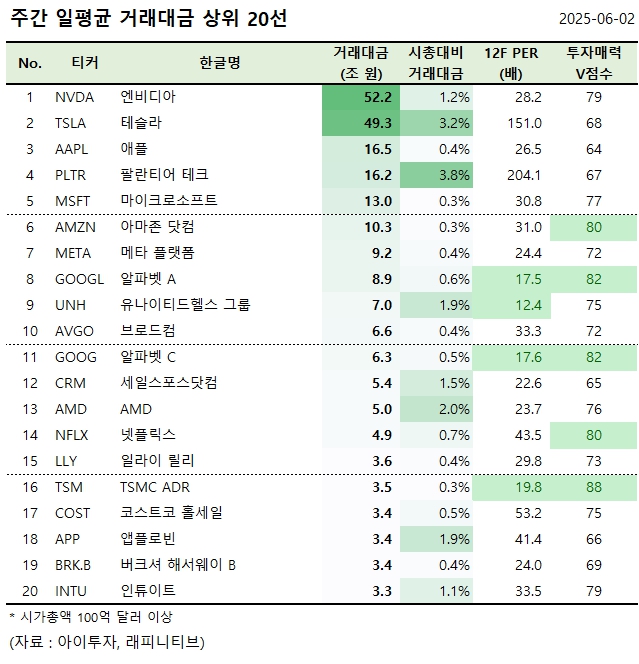 [美 주간탑] 엔비디아, 거래대금 52.2조원 1위.. 거래대금 상위 20선