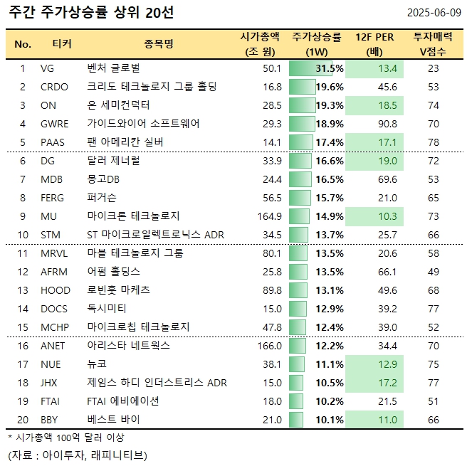 지난주 미국증시에서 가장 높은 주가상승률을 기록한 종목은 벤처 글로벌(VG)로 한 주간 31.5% 상승했다(시가총액 100억 달러 이상). 투자매력 V점수는 23점을 기록했다.