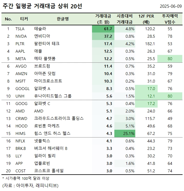 거래대금 상위 종목 가운데 투자매력 V점수가 80점 이상인 종목은 메타 플랫폼(META), 유나이티드헬스 그룹(UNH) 등 2개다.