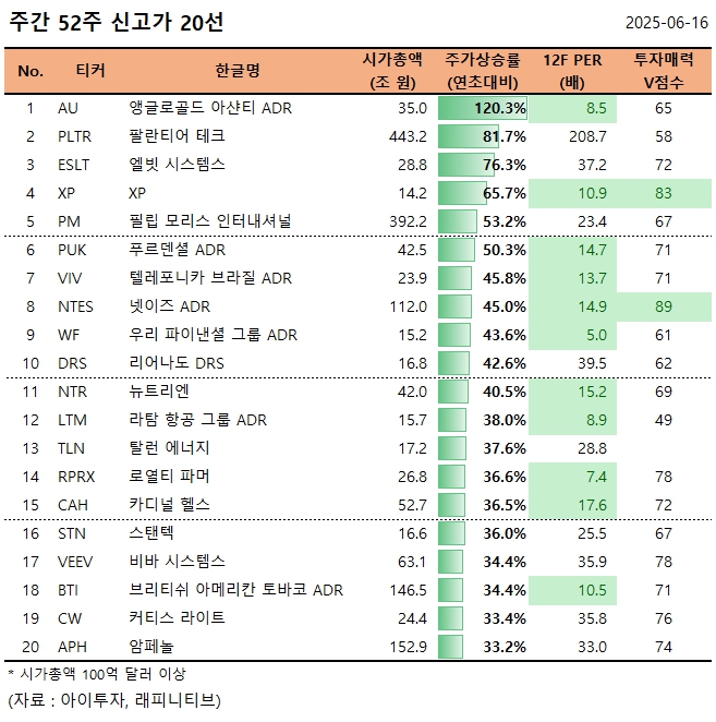 신고가 상위 기업 중 12개월 선행 PER이 20배 이하인 종목은 앵글로골드 아샨티 ADR(AU), XP(XP), 푸르덴셜 ADR(PUK), 텔레포니카 브라질 ADR(VIV) 등 11개로 집계됐다.