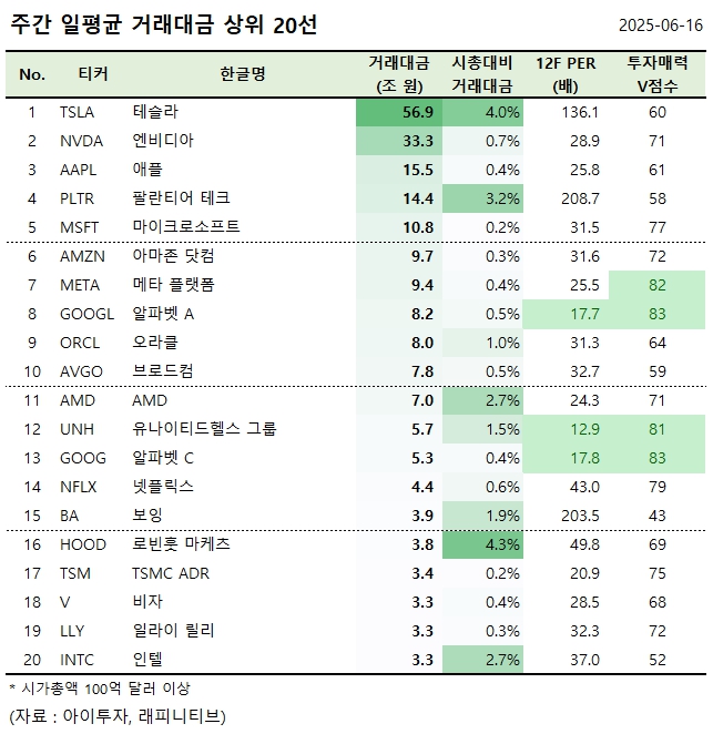 [美 주간탑] 테슬라, 거래대금 56.9조원 1위.. 거래대금 상위 20선
