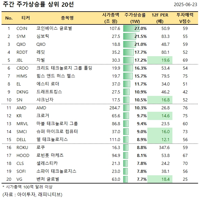 지난주 미국증시에서 가장 높은 주가상승률을 기록한 종목은 코인베이스 글로벌(COIN)로 한 주간 27% 상승했다(시가총액 100억 달러 이상). 투자매력 V점수는 59점을 기록했다.