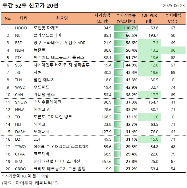 지난주 미국증시에서 52주 신고가를 기록한 종목은 로빈훗 마케츠(HOOD), 클라우드플레어(NET), 방쿠 브라데스쿠 우선주 ADR(BBD), 뉴몬트(NEM), 씨게이트 테크놀로지 홀딩스(STX) 등 34종목(시가총액 100억 달러 이상)으로 집계됐다.