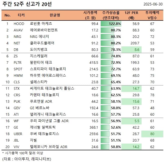 지난주 미국증시에서 52주 신고가를 기록한 종목은 로빈훗 마케츠(HOOD), 에어로바이런먼트(AVAV), NRG 에너지(NRG), 클라우드플레어(NET), 도이치뱅크(DB) 등 95종목(시가총액 100억 달러 이상)으로 집계됐다.