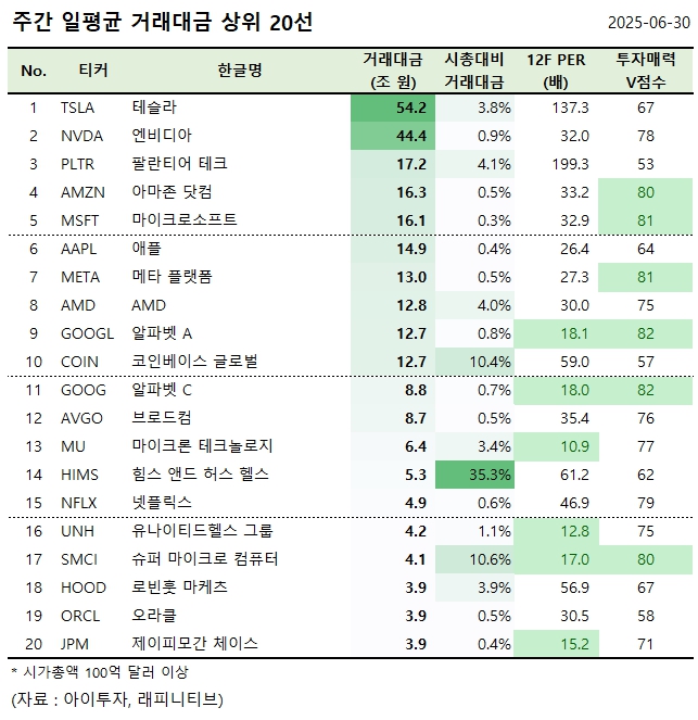 이 밖에 엔비디아(NVDA), 팔란티어 테크(PLTR), 아마존 닷컴(AMZN), 마이크로소프트(MSFT) 등도 거래대금이 많았다.